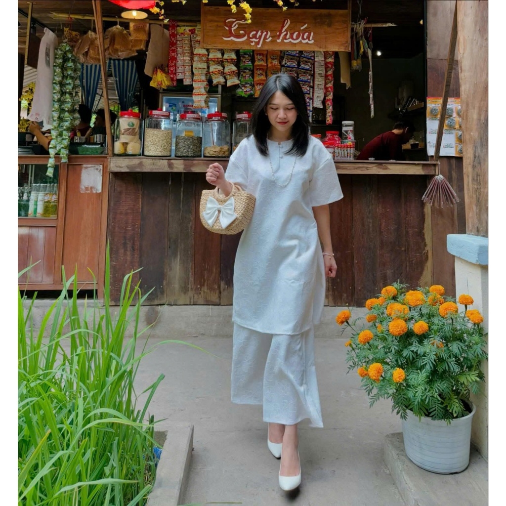 Set áo dài cách tân thiết kế Chicatique Ý Viên chất gấm Hàn form truyền thống quần suông tôn dáng